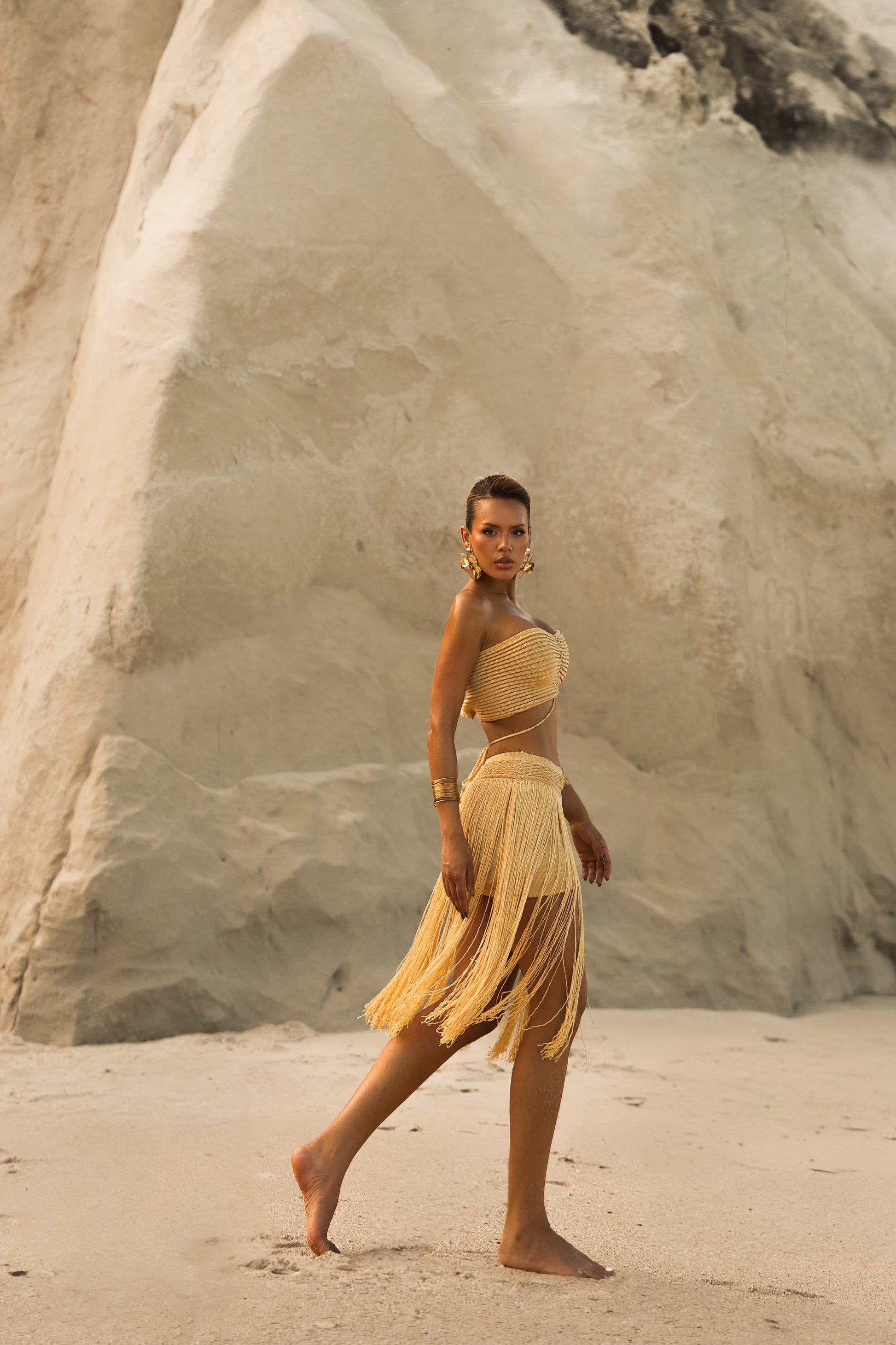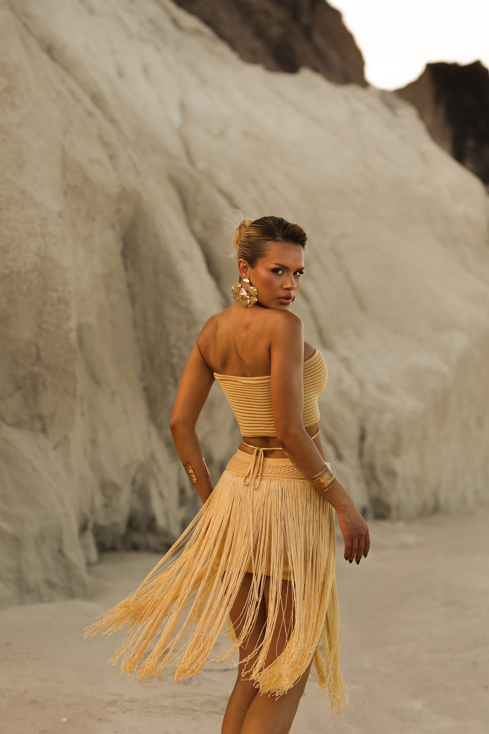 Composto por um cropped estruturado e uma saia de franjas em tricot, ele entrega leveza visual, fluidez e uma sensualidade elegante — ideal para os dias de sol e fins de tarde que pedem presença.
