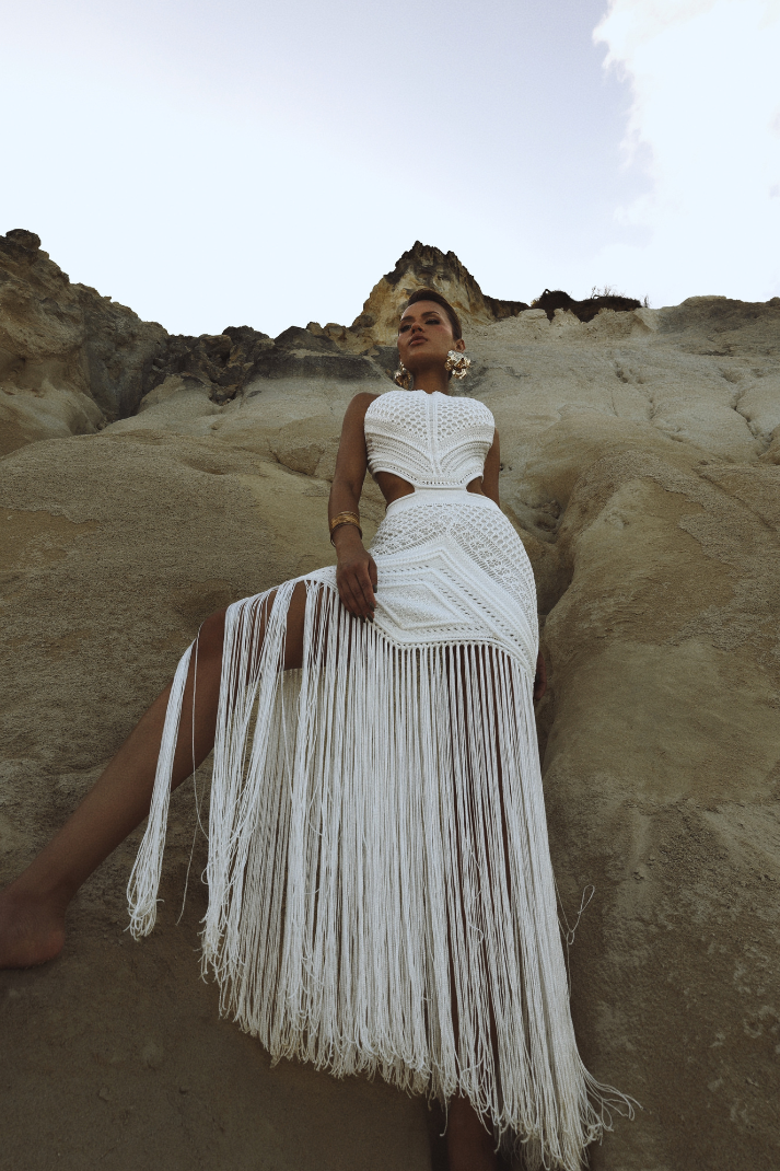 Com recortes estratégicos, tricot texturizado e franjas longas que acompanham o vento, ele cria uma silhueta marcante, feminina e cheia de movimento.