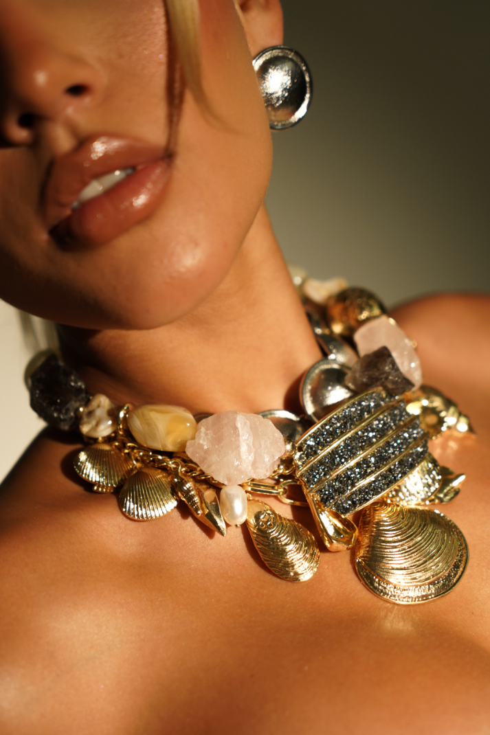 O Mix Aura é a expressão máxima de brilho e presença. Inspirado nas formas do mar e no encontro entre luz e profundidade, este mix combina conchas metálicas, pedras naturais e detalhes dourados que refletem sofisticação em cada ângulo.
