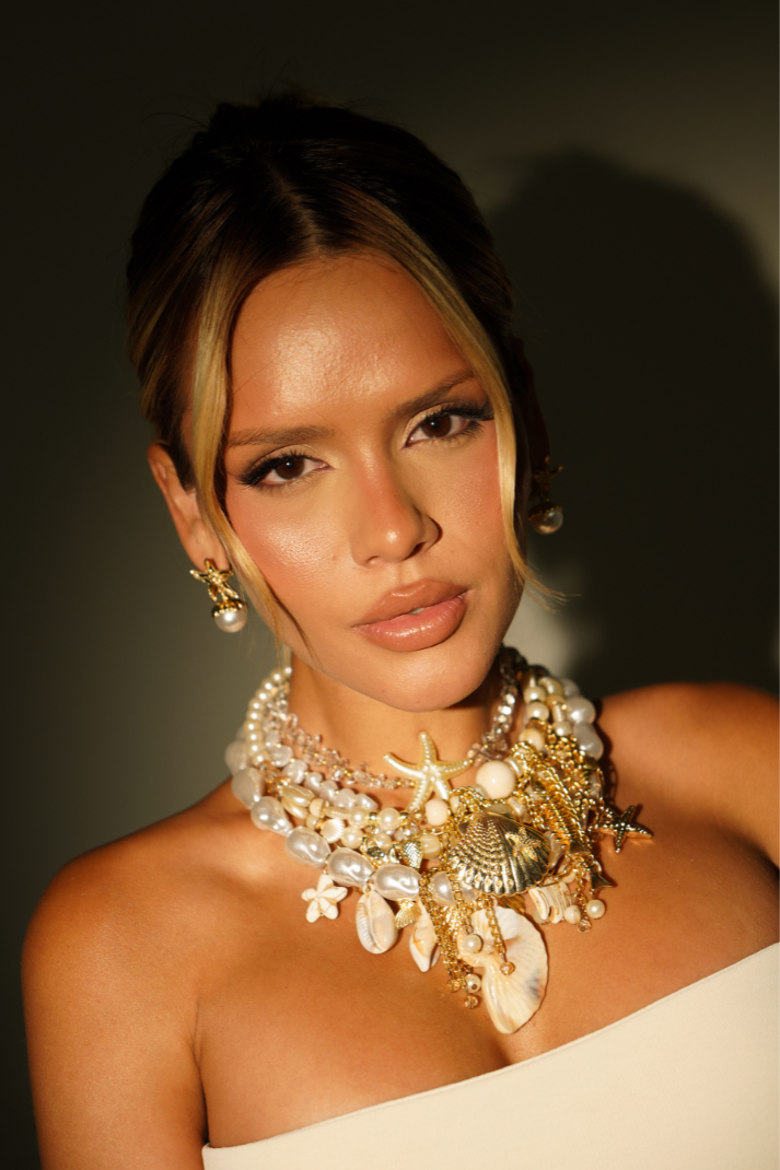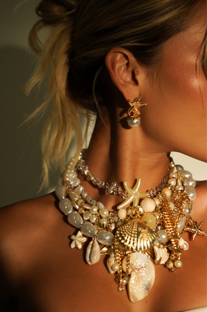 Um colar exuberante composto por camadas de pérolas, cristais e pingentes dourados inspirados na estética marinha — conchas, estrelas-do-mar, formatos orgânicos e elementos que remetem à luz e ao movimento da praia.