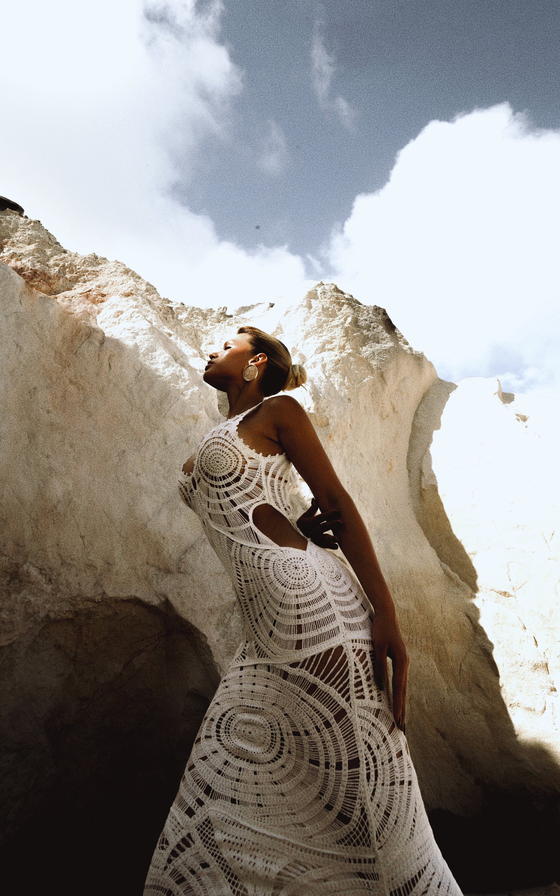 O decote profundo e o recorte nas costas equilibram força e delicadeza, enquanto o caimento leve acompanha o movimento do vento e do corpo.