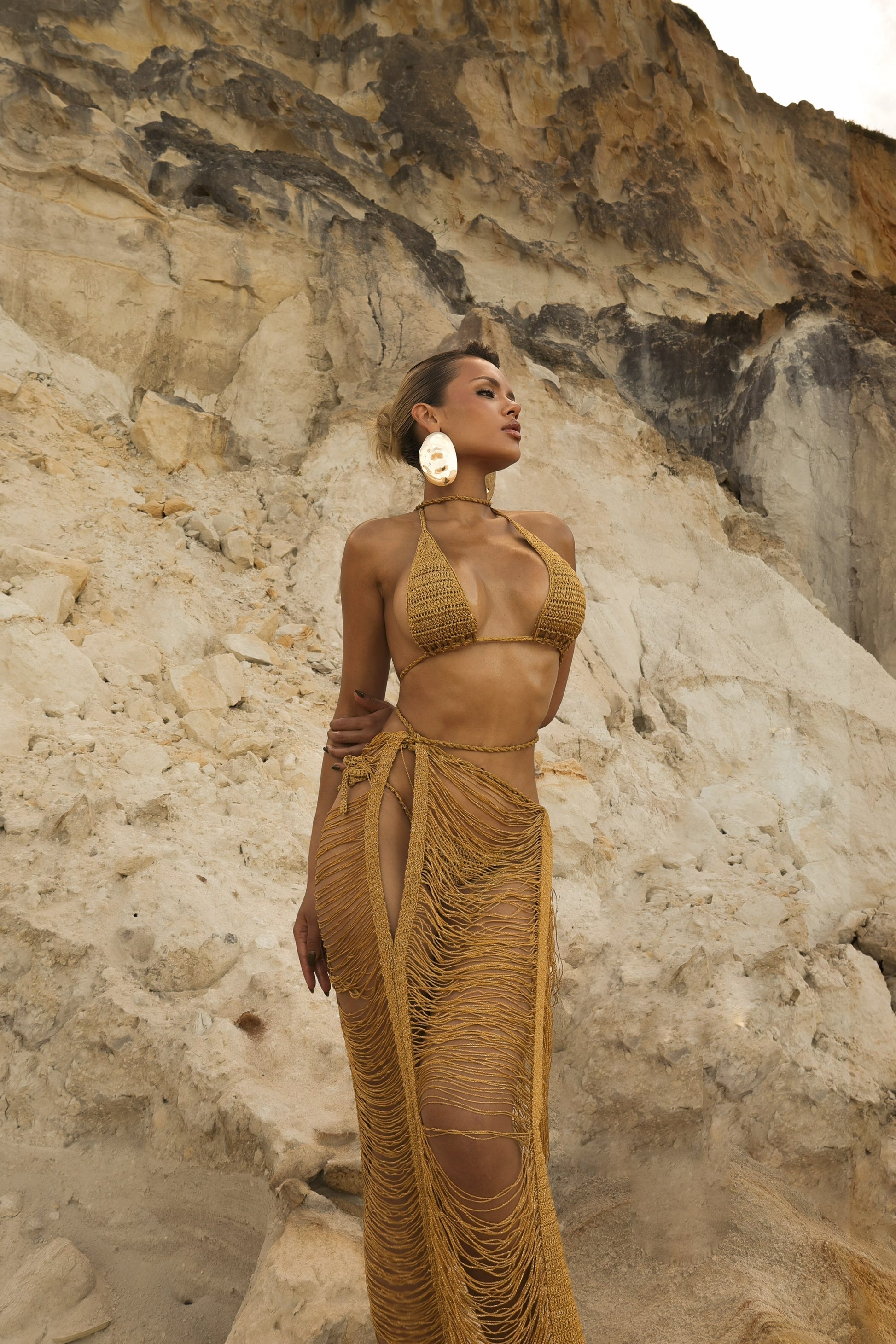 Com franjas longas, tricot dourado e um design que permite múltiplas formas de uso, ele transforma qualquer produção — do look de praia ao visual noite.